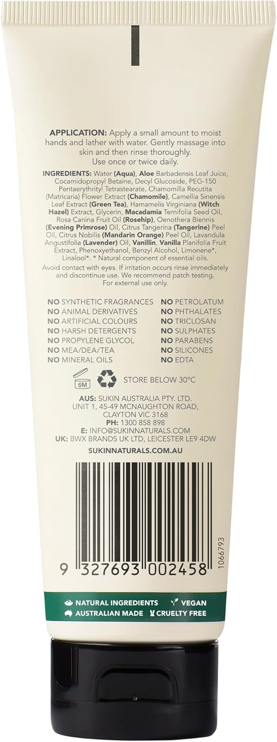 Water (Aqua), Aloe Barbadensis Leaf Juice, Cocamidopropyl Betaine, Decyl Glucoside, Peg-150 Pentaerythrityl Tetrastearate, Chamomilla Recutita (Matricaria) Flower Extract (Chamomile), Camellia Sinensis Leaf Extract (Green Tea), Hamamelis Virginiana (Witch Hazel) Extract, Glycerin, MACADAMIA Ternifolia Seed Oil, Rosa Canina Fruit Oil (Rose Hip), Oenothera Biennis (Evening Primrose) Oil, Citrus Tangerina (Tangerine) Peel Oil, Citrus Nobilis (Mandarin ORANGE) Peel Oil, Lavandula Angustifolia (Lavender) Oil, Vanillin, Vanilla Planifolia Fruit Extract, Phenoxyethanol, Benzyl Alcohol, Limonene, Linalool.